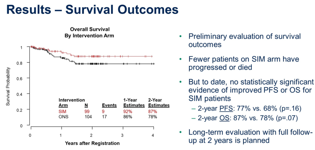 目前在所有203名患者中,SIM组和ONS组进展或死亡人数分别为17人和26人,2年PFS估计值分别为77.2%和68.3%(单侧P=0.16)。SIM组和ONS组的死亡人数分别为9人和17人,2年OS估计值分别为87.4%和78.2%(单侧P=0.07)。