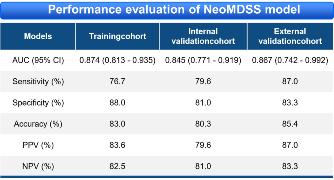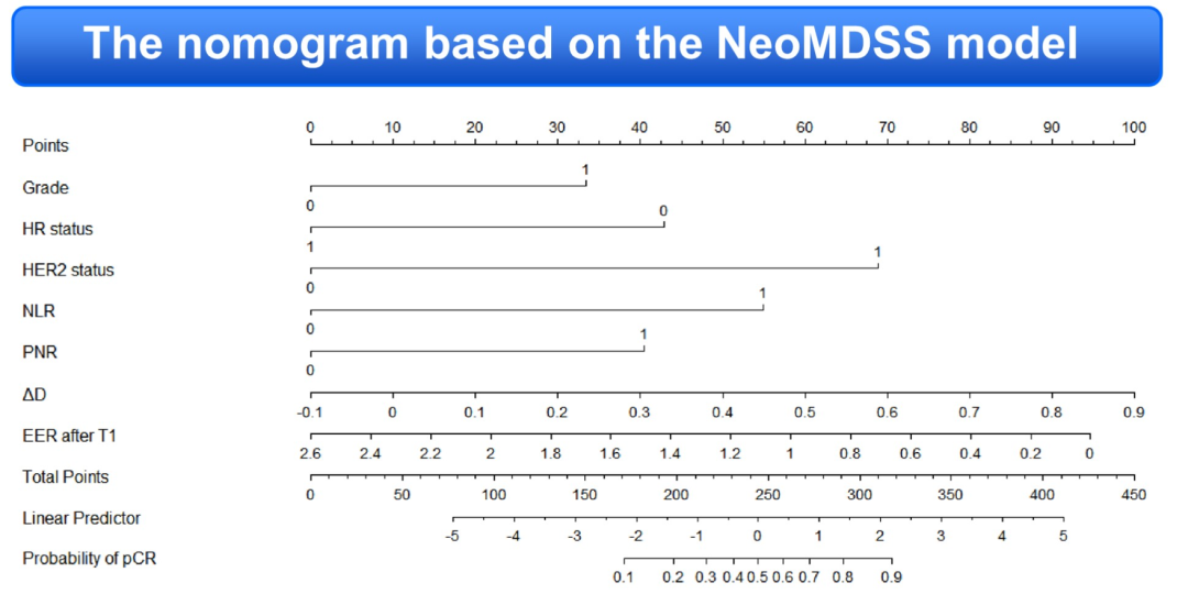 NeoMDSS模型是1st-NAT时用于计算并准确预测NAT后pCR率的便捷临床实践工具。该模型有助于临床医生决定是否修改治疗方案,并优化对NAT反应不佳患者的个性化治疗策略。