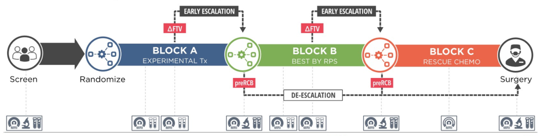 A阶段接受不含化疗的新型药物(减法),如果达到“预测残存肿瘤负荷(Predicted Residual CancerBurden,preRCB)”,则提前进行手术,达不到preRCB则进入B阶段;