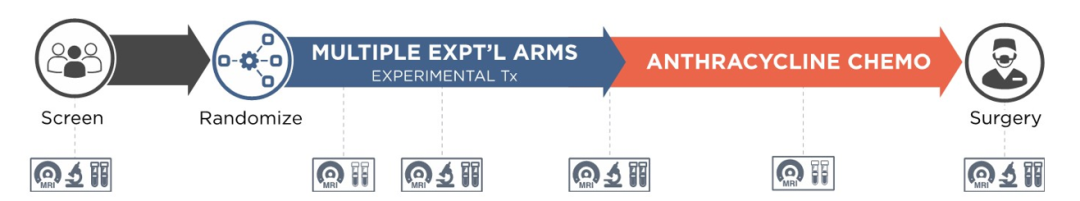 自适应平台I-SPY研究在乳腺癌领域盛名已久,其全称是“Investigation of Serial Studies to Predict Your Therapeutic Response With Imaging and Molecular Analysis”,旨在通过影像学和分子分析预测治疗反应,筛选出最佳的新辅助治疗方案。自2010年以来,该研究已评估了23种药物,其中10种药物达到“毕业标准”,即预计3期试验成功率在85%以上。