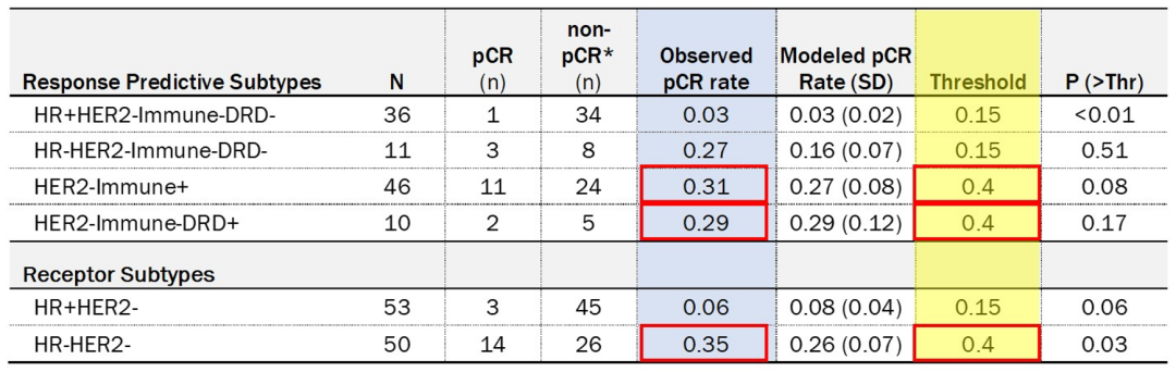 Dato-DXd单药新辅助治疗的pCR率整体上没有达到预设的阈值(40%),其中HER2-/Immune+和HER2-/Immune-/DRD+患者的pCR率分别为31%和29%,而传统分型TNBC患者的pCR率则为35%。