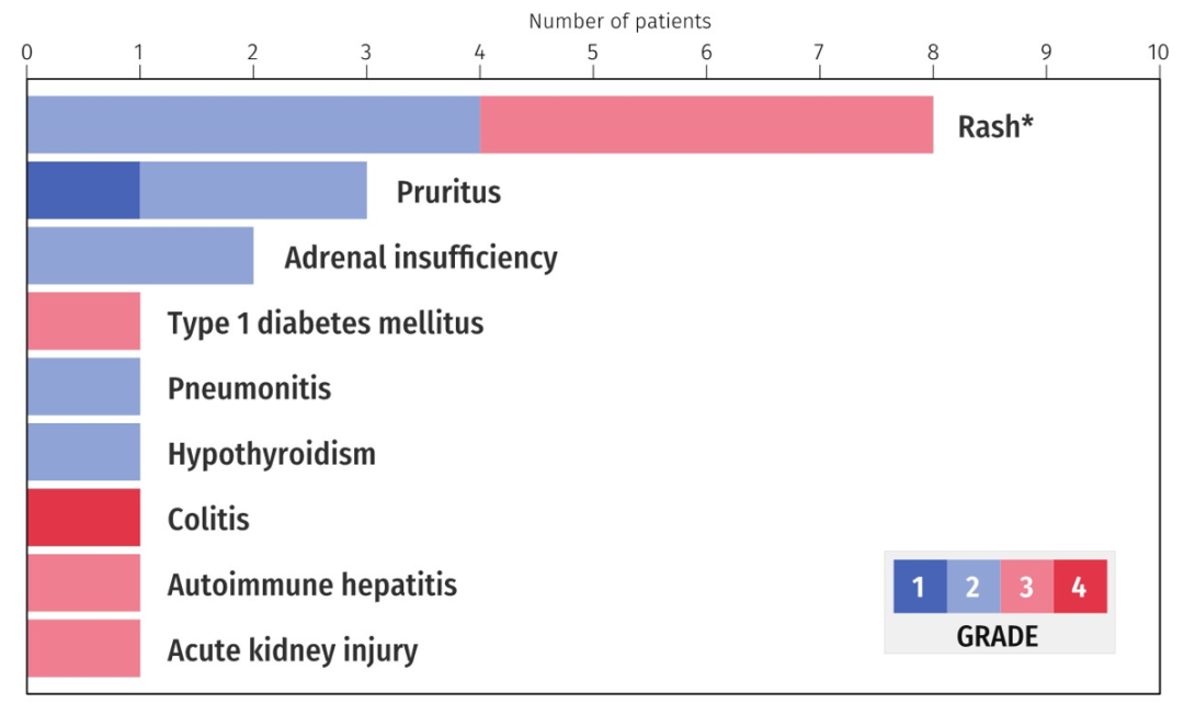此外,有4例患者发生3级免疫相关皮疹(4例),3级1型糖尿病、自身免疫性肝炎、急性肾损伤各1例,4级结肠炎1例。