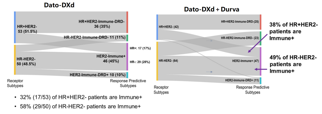 Dato-DXd±Durva两个队列的患者在治疗前通过活检确定RPS亚型,其中S1、S2、S3、S4这4种亚型的患者可以入组,属于传统亚型HR+/HER2-和TNBC患者。两个队列患者具体RPS亚型分布如下图所示。整体上有32%~38%的HR+/HER2-患者和49%~58%的TNBC患者存在免疫标志物阳性(Immune+)。