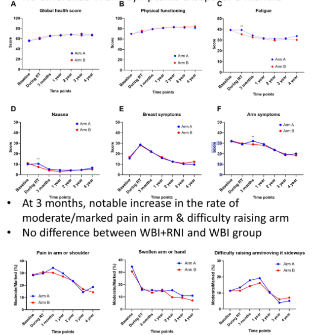 2017年4月至2021年12月,纳入840例患者;777人接受了指定的干预,750人完成了基线PRO问卷(WBI+RNI 387人,WBI 363人)。总的来说,PRO随着时间的推移而改善(P<0.001)。在RT期间,与WBI组相比,WBI+RNI组经历了更多的疲劳、恶心和呕吐(P<0.05),总体健康状况(P=0.090)和身体功能(P=0.049)较低,具有临床意义。在RT后3-6个月,WBI+RNI组也显示出更高的手臂症状评分(P=0.030)。除了这些特定的时间点外,在治疗组之间的其他PRO评分,包括手臂和乳房症状,没有观察到显著差异。此外,除放疗期间的乳房症状外,不同的放疗技术和分割方法在PRO上没有显著差异。