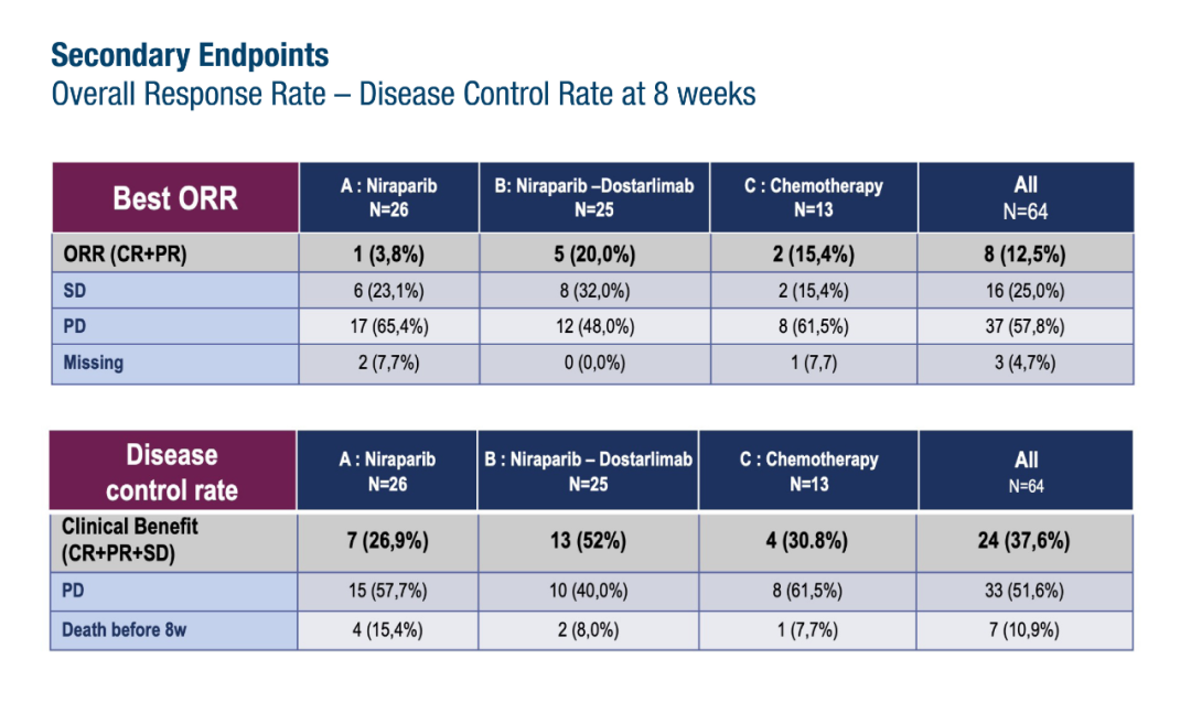 在11.2个月的中位随访期内,尼拉帕利组的中位PFS为2.0个月,尼拉帕利+dostarlimab组的中位PFS为2.7个月,化疗组的中位PFS为1.9个月;三组的总生存期(OS)分别为6.7个月、6.5个月和4.5个月。