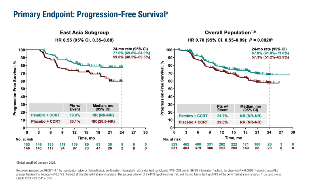 在2024年ESMO妇科癌症大会(佛罗伦萨,6月20-22日)上,该试验发布亚组分析的结果(摘要23O)。四分之一的患者来自东亚(n=299/1060),东亚亚组分析结果为试验总体分析结果提供了重要佐证。中位随访时间为19.3个月,在东亚亚组中,将帕博利珠单抗与CRT联合使用可使进展或死亡风险降低45%(风险比<hr/>=0.55;95%置信区间[CI]0.35–0.88)。帕博利珠单抗联合CRT的两年无进展生存(PFS)率为77.6%,而单独使用CRT的两年PFS率为59.8%。