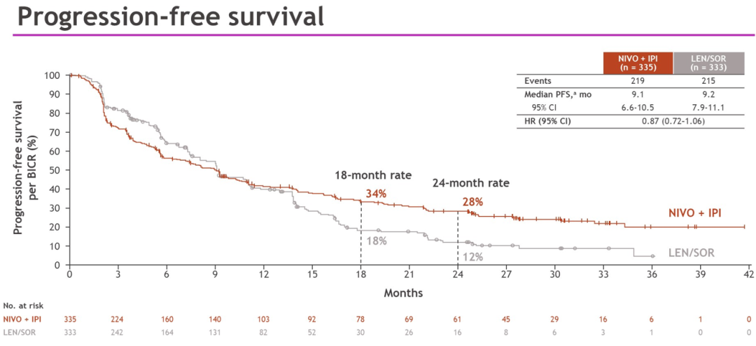 虽然两组的PFS没有统计学差异,但9个月后,两组的PFS曲线发生交叉,而且之后的区分愈加明显,并且纳武利尤单抗联合伊匹木单抗组的18个月和24个月PFS率也明显高于对照组。