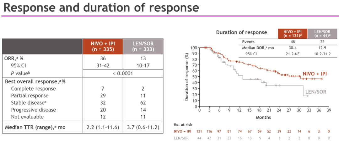 既往CheckMate 040研究中的纳武利尤单抗联合伊匹木单抗治疗的ORR为32%,而本次ASCO大会公布的CheckMate 9DW研究的ORR高达36%,也是目前肝癌Ⅲ期研究的最高数值;并且纳武利尤单抗联合伊匹木单抗组的DoR也高达30.4个月(对照组12.9个月),同样创造了肝癌领域目前最高的缓解持续时间。