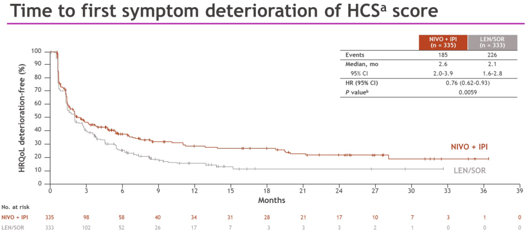 就不良反应而言,两组的治疗相关不良反应(TRAE)发生率基本一致。但SAE从数值上看纳武利尤单抗联合伊匹木单抗组似乎更高,特别需要注意肝脏相关不良事件。纳武利尤单抗联合伊匹木单抗组的至症状恶化时间呈现更优趋势(2.6个月vs.2.1个月,P=0.0059),并且该组患者的生活质量也得到描述性改善。