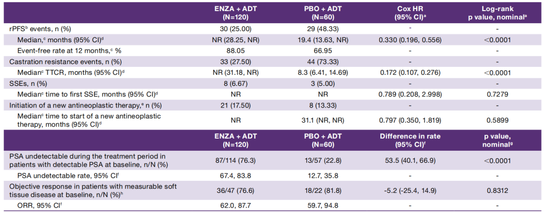 此外,该研究的多个次要终点也显示恩扎卢胺的积极获益:影像学疾病进展风险降低67%(rPFS:NR vs 19.4个月,HR 0.330,P<0.001),去势抵抗风险降低82.8%(TTCR:NR vs 8.3个月,HR 0.172,P<0.001),PSA降低至不可检测水平的比例(76.3%vs 22.8%)提高2倍多;至首次新抗肿瘤治疗也有显著延迟(HR 0.214)。