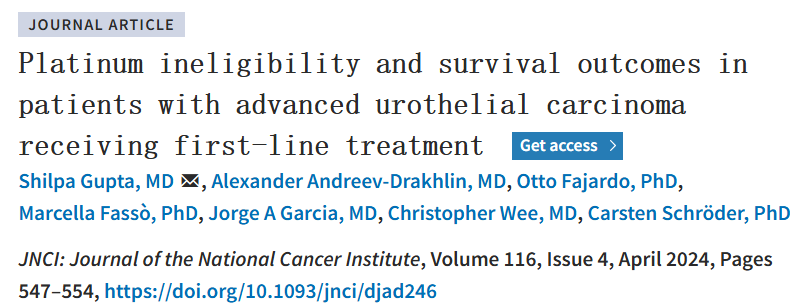 参考文献:Gupta S,Andreev-Drakhlin A,Fajardo O,et al.Platinum ineligibility and survival outcomes in patients with advanced urothelial carcinoma receiving first-line treatment[J].JNCI:Journal of the National Cancer Institute,2024,116(4):547-554.
