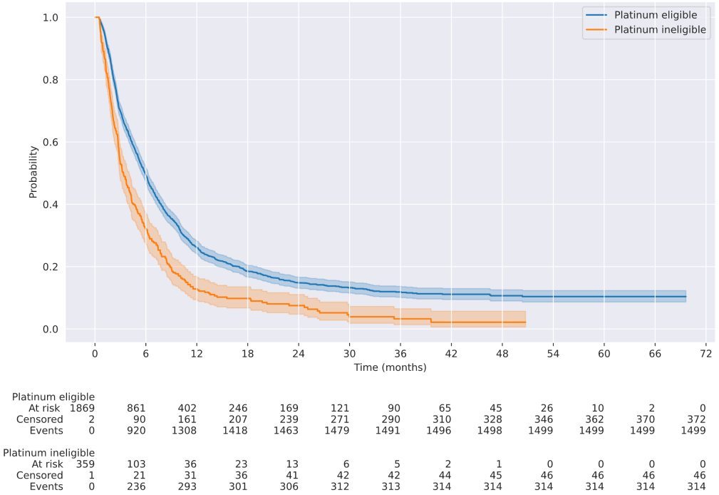 在铂类耐受患者中,少数(36%,n=677)接受了PD-1/PD-L1抑制剂;大多数接受了铂类化疗(64%,n=1229):其中多于半数(58%,n=709)接受了顺铂类方案,而42%(n=520)接受了卡铂类方案。