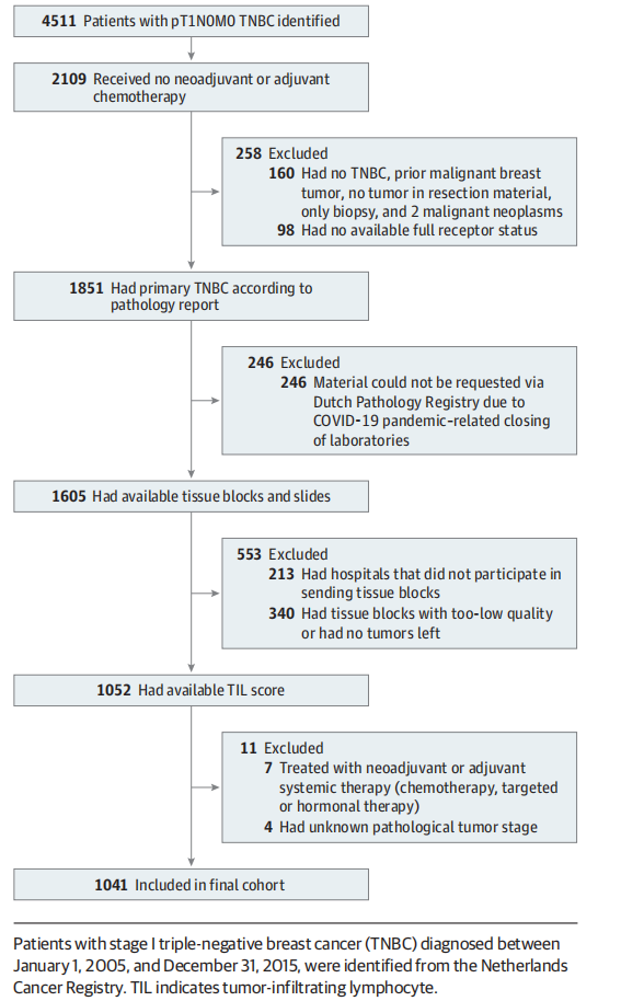 未接受化疗的Ⅰ期三阴性乳腺癌患者中的肿瘤浸润性淋巴细胞检测》的文章。这项队列研究使用了荷兰癌症登记处2005年1月1日至2015年12月31日期间被诊断为Ⅰ期TNBC的患者,只选择了未接受新辅助和/或辅助化疗的患者。数据分析在2023年2月至10月期间进行。