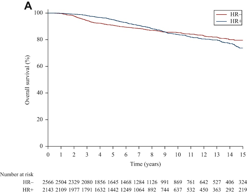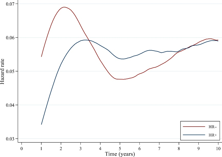 HR+患者和HR-患者的8年BCSS分别为88.9%和87.8%。乳腺癌确诊后的前5年内,HR+患者BCSS优于HR-患者(aHR 0.65),而在5年后则无差异(aHR 1.22)。HR+患者和HR-患者的8年OS分别为88.1%和87.1%。乳腺癌确诊后的前5年内,HR+患者的OS优于HR-患者(aHR 0.66),而5年后则无差异(aHR 1.12)。对于DFS、BCSS和OS而言,HR+和HR-间的风险比随时间而变化,激素受体状态和生存事件的相互作用P值<0.05,表明风险与时间为非比例性关系。