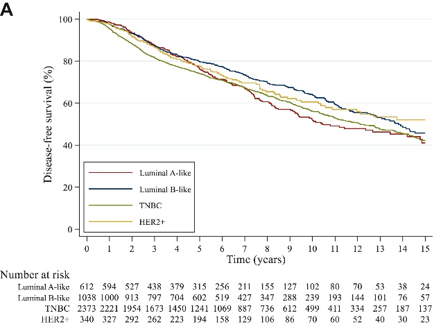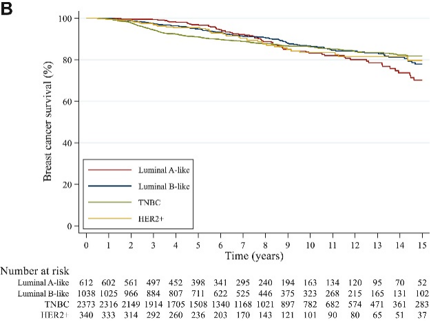 在散发性乳腺癌患者中,管腔A型通常侵袭性较低,因此预后更好。然而该研究发现,管腔A型患者的DFS似乎并未优于其他亚型。这一结果可能会使人们重新关注携带BRCA的HR+年轻乳腺癌的生物学侵袭性。管腔A型更可能携带BRCA2突变,通常认为比散发性乳腺癌更具生物学侵袭性。这项研究也发现,对于携带BRCA2胚系突变的HR+患者,首个5年随访后的预后似乎最差;同时也应注意相对于其他亚型,管腔A型患者接受(新)辅助化疗的比例最低,仅为75.0%(散发性乳腺癌常常避免化疗)[17]