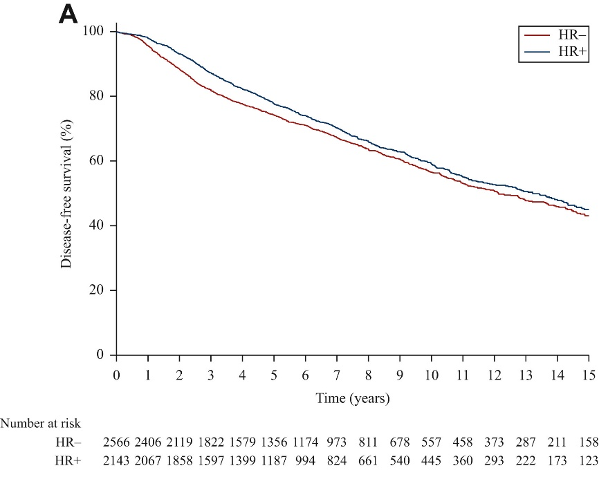 HR+患者和HR-患者的8年DFS分别为65.8%(95%CI,63.4%~68.2%)和63.4%(95%CI 61.2%~65.6%)。乳腺癌确诊后的前5年内,HR+患者DFS优于HR-患者(调整后HR 0.77)。