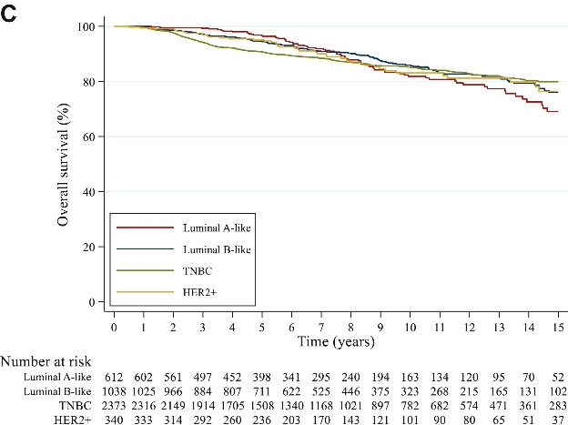 在符合本次分析条件的4363名BRCA年轻患者中,612名(14.0%)为管腔A型,1038名(23.8%)管腔B型,2373名(54.4%)为三阴型(TNBC),340名(7.8%)为HER2+型。TNBC患者更为年轻,且诊断时T1期更少,淋巴结受累更少,BRCA1比例更高,化疗比例更高。对于管腔A型患者,90.8%为2级肿瘤,53.3%为T1期,76.8%携带BRCA2,75.0%接受化疗。对于管腔B型患者,89.2%为3级疾病,38.8%为T1期,56.8%携带BRCA2,93.2%接受化疗。
